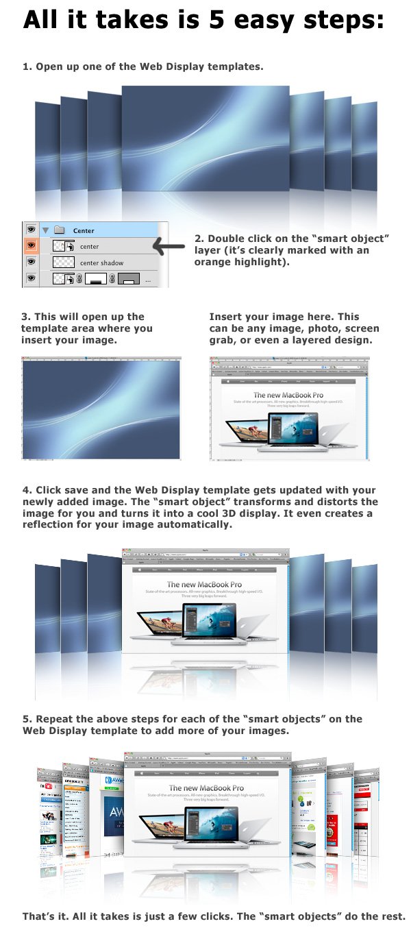 These templates are based on Photoshop “smart objects” that do all of the hard work of creating these 3D displays for you. All you have to do is click a few buttons.