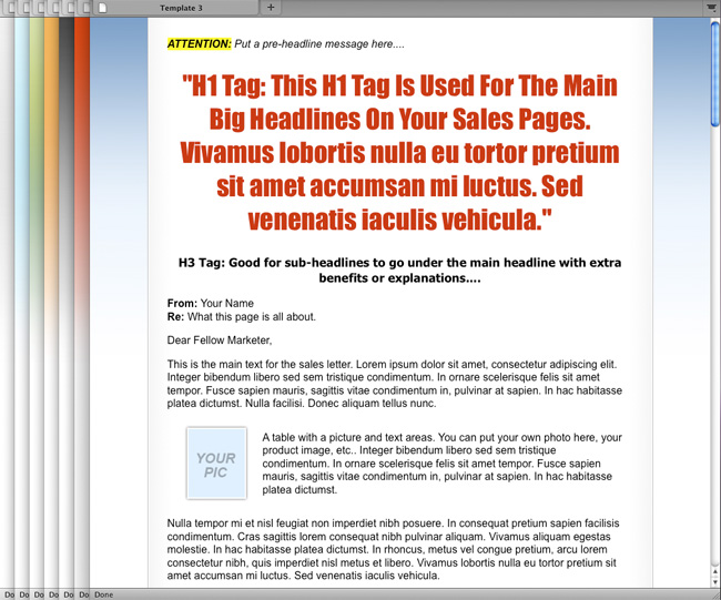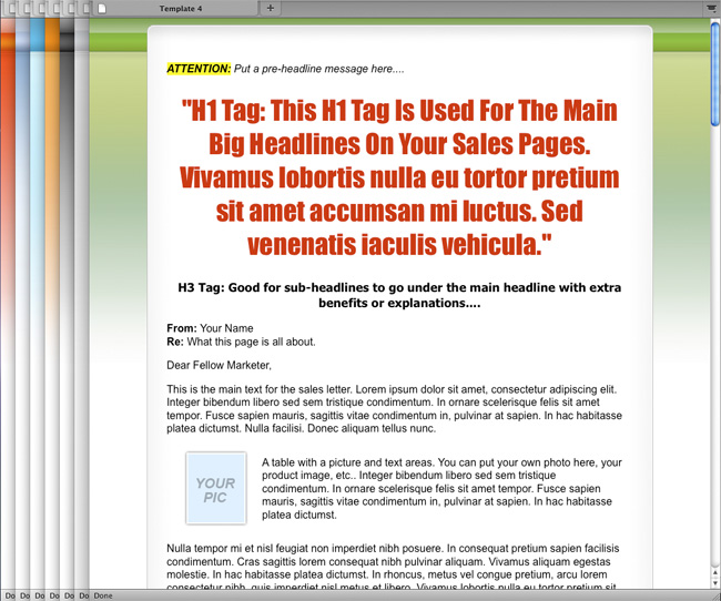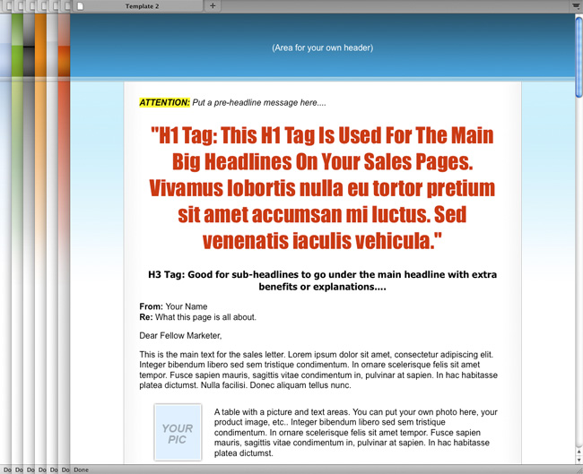 Each of these different variations of the template all come with the same formatted and customizable elements, and everything already placed in appropriate places and ready to go. So you can quickly put together a nice looking mini site by simply inserting your own details into the templates.