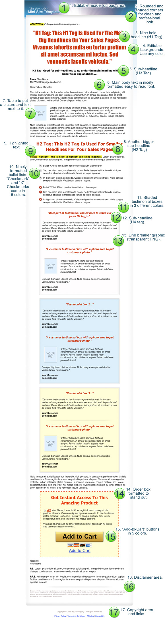 Pretty much everything you need to make a mini site is in this template, and of course you can add and customize things further (like insert a product image or any other graphics you might have, change the fonts or text colors, change the background colors, etc..)