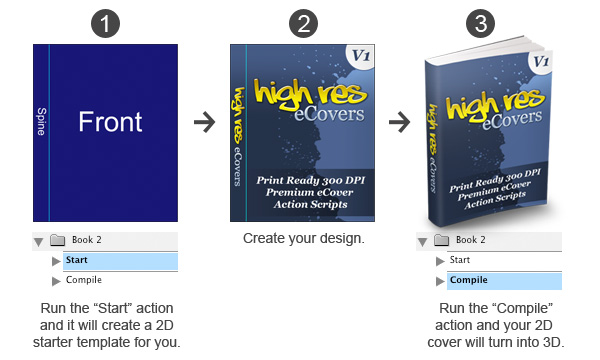 So basically, you start with a blank template or a “starter template. You then create your own design. And finally you play the eCover action of your choice and the cover turns into 3D right before your eyes.