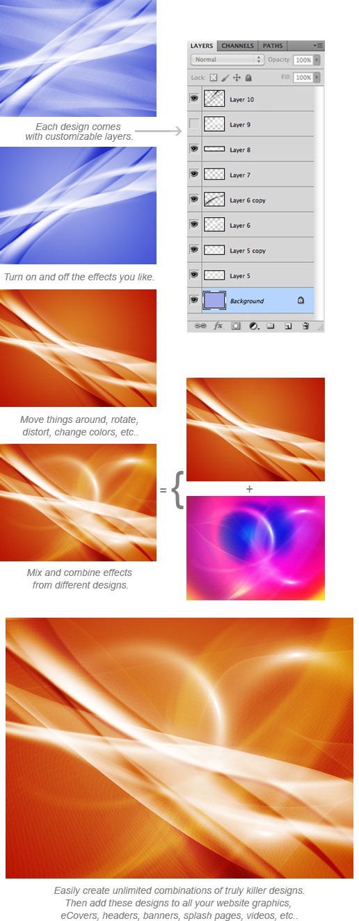 | Each of these background images comes in a layared PSD format. That means you can take each element you see in the design, and customize it to your liking. Turn certain effects on and off, mix them up, move them around, resize them, flip and rotate them, change the colors, combine two or more designs together, take just one certain effect like a grid, and add just that one effect to your design, etc.. |