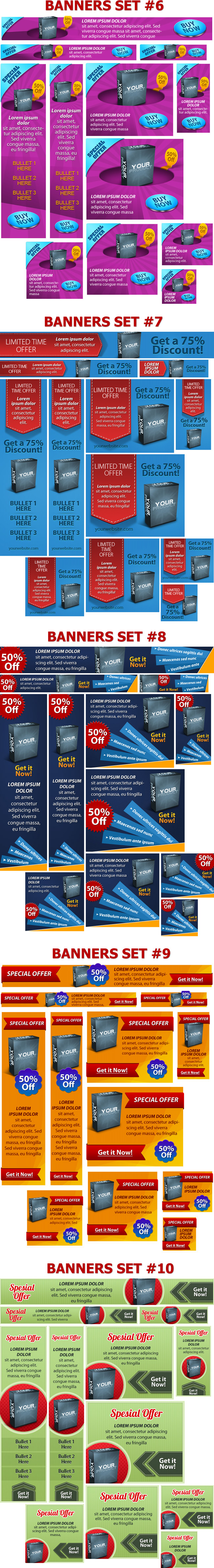 These 10 banner templates are created in such a way that they can actually be developed further into 100’s of different banners for different niches (if you wanted to do that). They’re very versatile.
