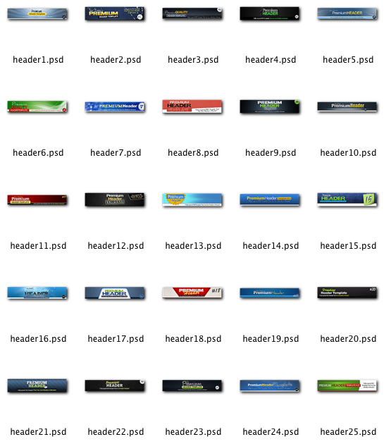 Again, this package is all about quality vs quantity. So what you get is simple: you’ll get 25 premium header templates with layered PSD source files. The templates are all at least 900 pixels wide. I made them that size so that they’re big enough for most sites, and you can easily resize them to any smaller size you want (like 800 pixels wide or 700 pixels wide).
