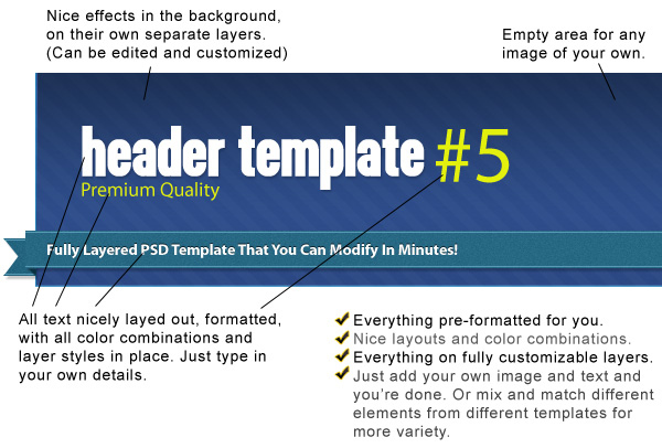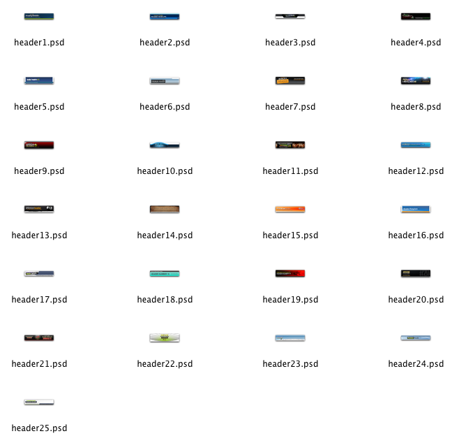 Again, this package is all about quality vs quantity. So what you get is simple: you’ll get 25 premium header templates with layered PSD source files. The templates are all at least 900 pixels wide. I made them that size so that tehy’re big enough for most sites, and you can easily resize them to any smaller size you want (like 800 pixels wide or 700 pixels wide).