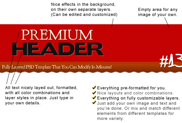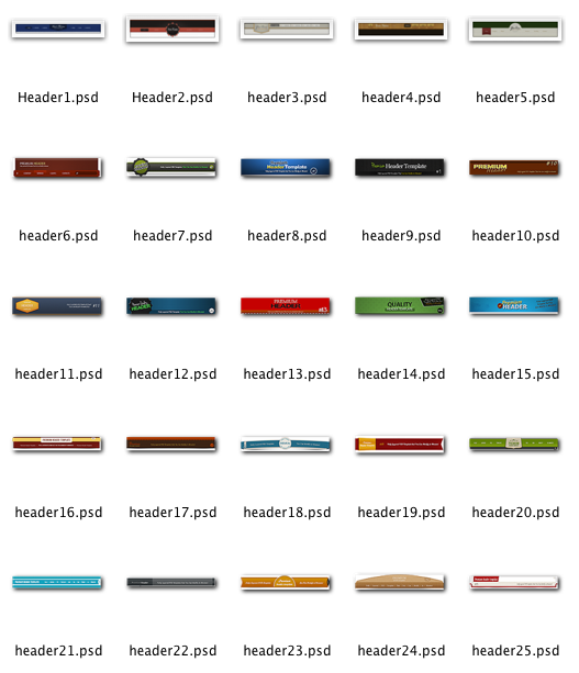 Again, this package is all about quality vs quantity. So what you get is simple: you’ll get 25 premium header templates with layered PSD source files. The templates are all at least 900 pixels wide. I made them that size so that they’re big enough for most sites, and you can easily resize them to any smaller size you want (like 800 pixels wide or 700 pixels wide).