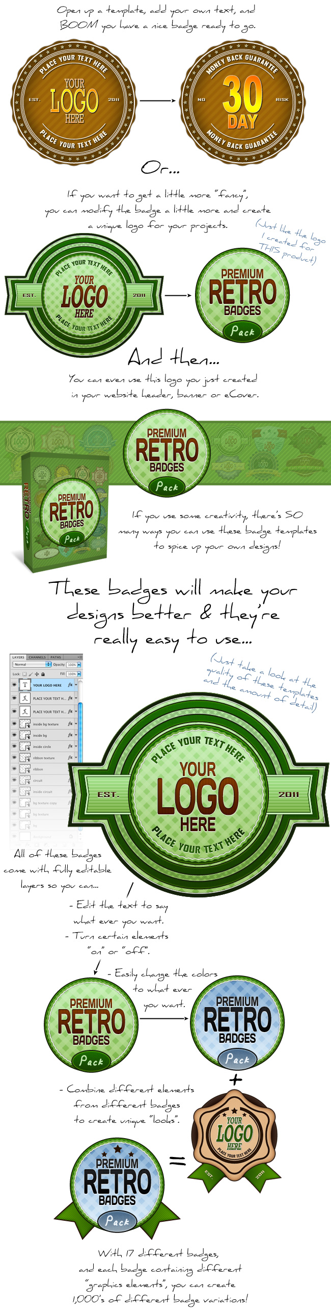 You get all of these Premium Retro Badge templates I showed you above, in layered PSD format… so you can edit each part of the template. Plus, these PSD files are made up of “smart” vector layers that can be resized to ANY size with no loss in quality. You can use these PSD templates with Adobe Photoshop or Photoshop Elements.