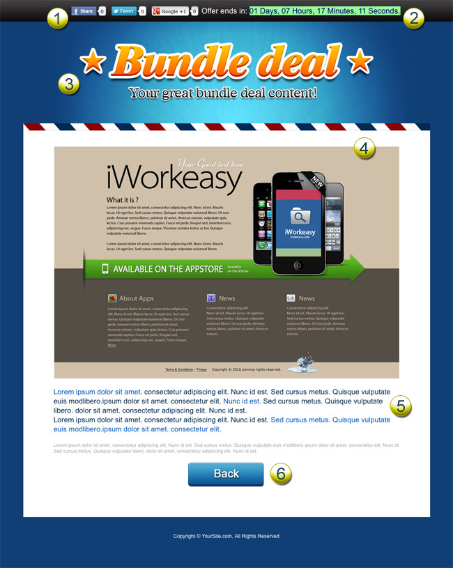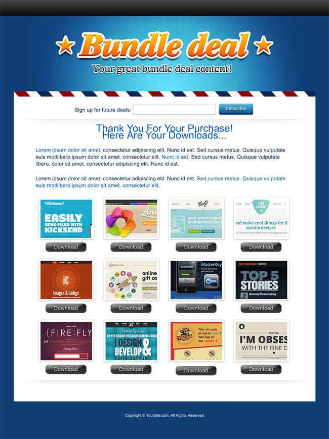 After a customer purchases your special offer, they’ll go to your download page. To make it easier for you to set everything up, I created a matching download page with nicely formatted tables for your product download links. Just insert your product images and link the buttons to your download locations.