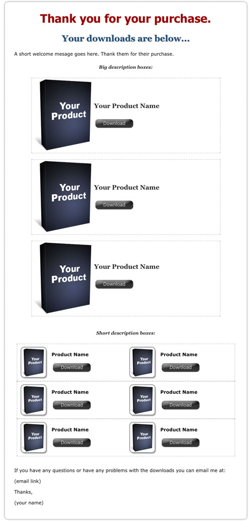 After a customer purchases your special offer, they’ll go to your download page. To make it easier for you to set everything up, I created a matching download page with nicely formatted tables for your product download links. Just insert your product images and link the buttons to your download locations.