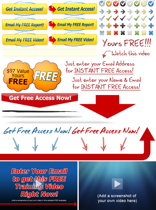 With this graphics elements library you’ll get things like big arrows, animated arrows, buttons, hand written text, and more. You can copy and paste these graphics elements into the templates to spice things up a little, and to add visual aids to make the opt-in form more noticeable. These graphics elements will come in different colors and styles. Here are some samples…