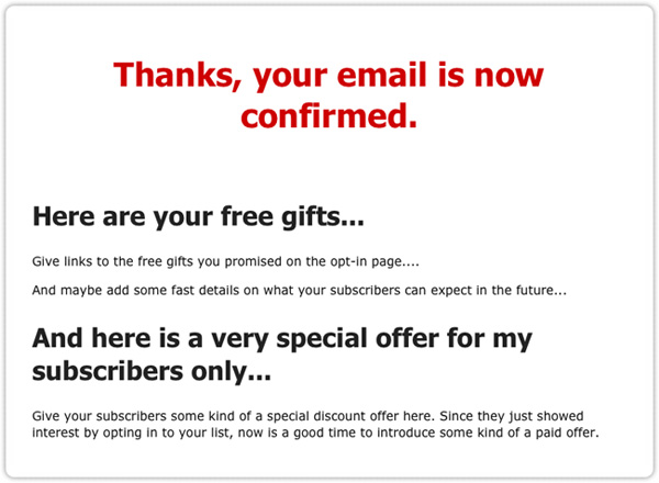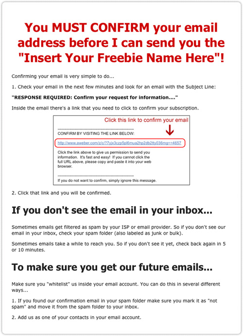 Getting someone to submit their email is great, but you also have to make sure they confirm it (if you use a double opt-in list). So to help you do that, you’ll be getting a matching “Confirm your email” page where you send your subscribers to confirm their email. That’s where you give people instructions for how to confirm their emails. I’ve set this page up for you, along with the instructions, and you get it as part of this package.