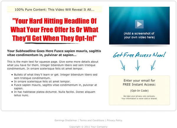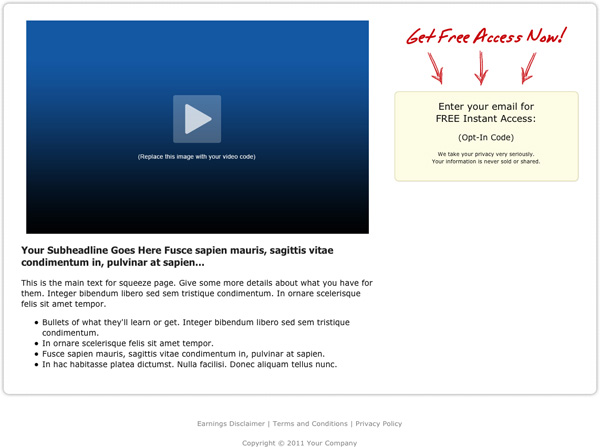 This is a very nice and clean template based on one of Jeff Walker’s squeeze pages. Here you add a scrrenshot of the free video that people will get after they opt-in. This screenshot works as a teaser and builds curiosity and anticipation. And you also write some sales copy to give people some quick details on why they should opt-in.
