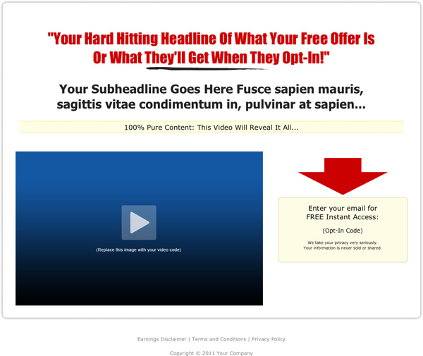 A simple and clean template based on another popular squeeze page format. Here you have a headline and sub-headline followed by a short video and an opt-in form on the side with an animated red arrow.